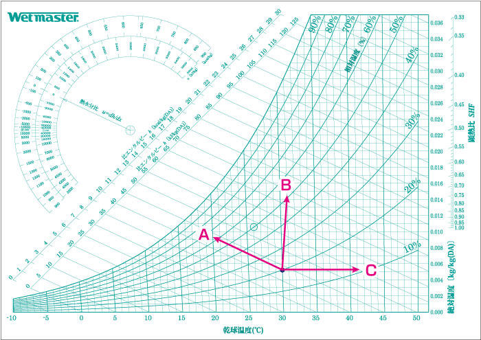 気化式加湿器で加湿した時の空気の状態変化を表した空気線図上の動きは、次のうちどれでしょうか?